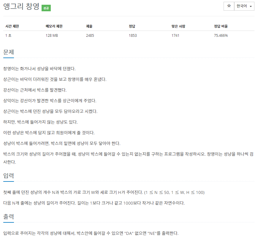 문제 이름 : 앵그리 창영 문제 번호 : 3034 사용 언어 : C 문제 유형 : 구현 문제는 다음과 같다. 문제를 풀어보도록 하자. 이번 문제 풀이에서 중요한 아이디어는, 상자 바닥에 대각선으로 들어가도 인정해 준다는 것이다. 계산을 쉽게하기 위해 math.h의 sqrt() 함수를 사용하도록 하자.(제곱근값을 반환하는 함수이다.) 따라서 다음과 같은 코드가 나온다. #define _CRT_SECURE_NO_WARNINGS #include #include int main() { int n, w, h, s; scanf("%d", &n); scanf("%d", &w); scanf("%d", &h); for (int i = 0; i < n; i++){ scanf("%d", &s); if (s
